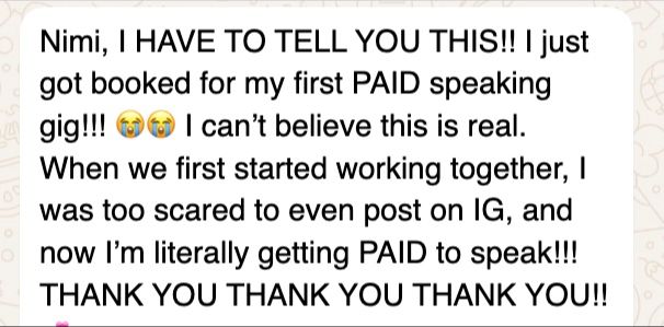 Iâll never forget the first time I turned my voice into a business. I was building my career in media, but I knew I had more to offerâI wanted to help others find their voice, grow their influence, and own every stage they stepped onto. I had an idea and ran with it. The next month, I gained clarity on my mission & message, launched my business SPKR by Nimi Mehta and had created a high-level public speaking brand strategy.